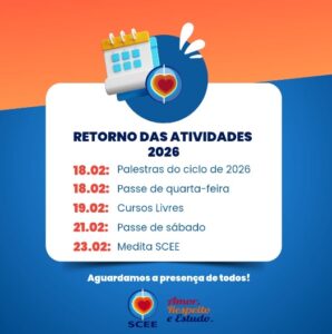 Os cursos da SCEE também reiniciam suas atividades no dia 19 de fevereiro, fortalecendo o estudo sistematizado e aprofundado da Doutrina Espírita.